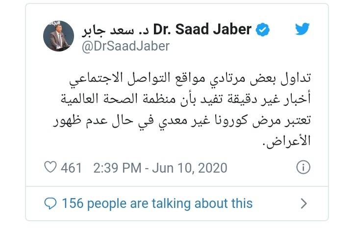 وبين جابر أن بعض مرتادي مواقع التواصل الاجتماعي تداولوا أخبارا تفيد بأن منظمة الصحة العالمية تعتبر مرض كورونا غير معد، في حال عدم ظهور الأعراض.