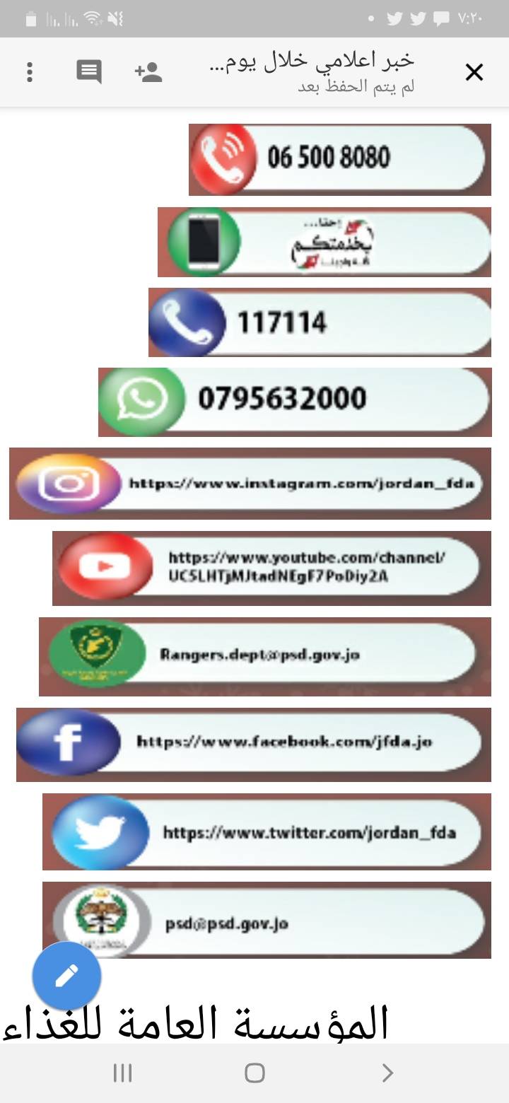 هذا وتهيب المؤسسة العامة للغذاء والدواء بالأخوة المواطنين في حال وجود أي معلومة أو ملاحظة أو شكوى لأي ممارسة قد تشكل خطراً على صحة وسلامة الغذاء ، الاتصال عبر الوسائل التالية:
