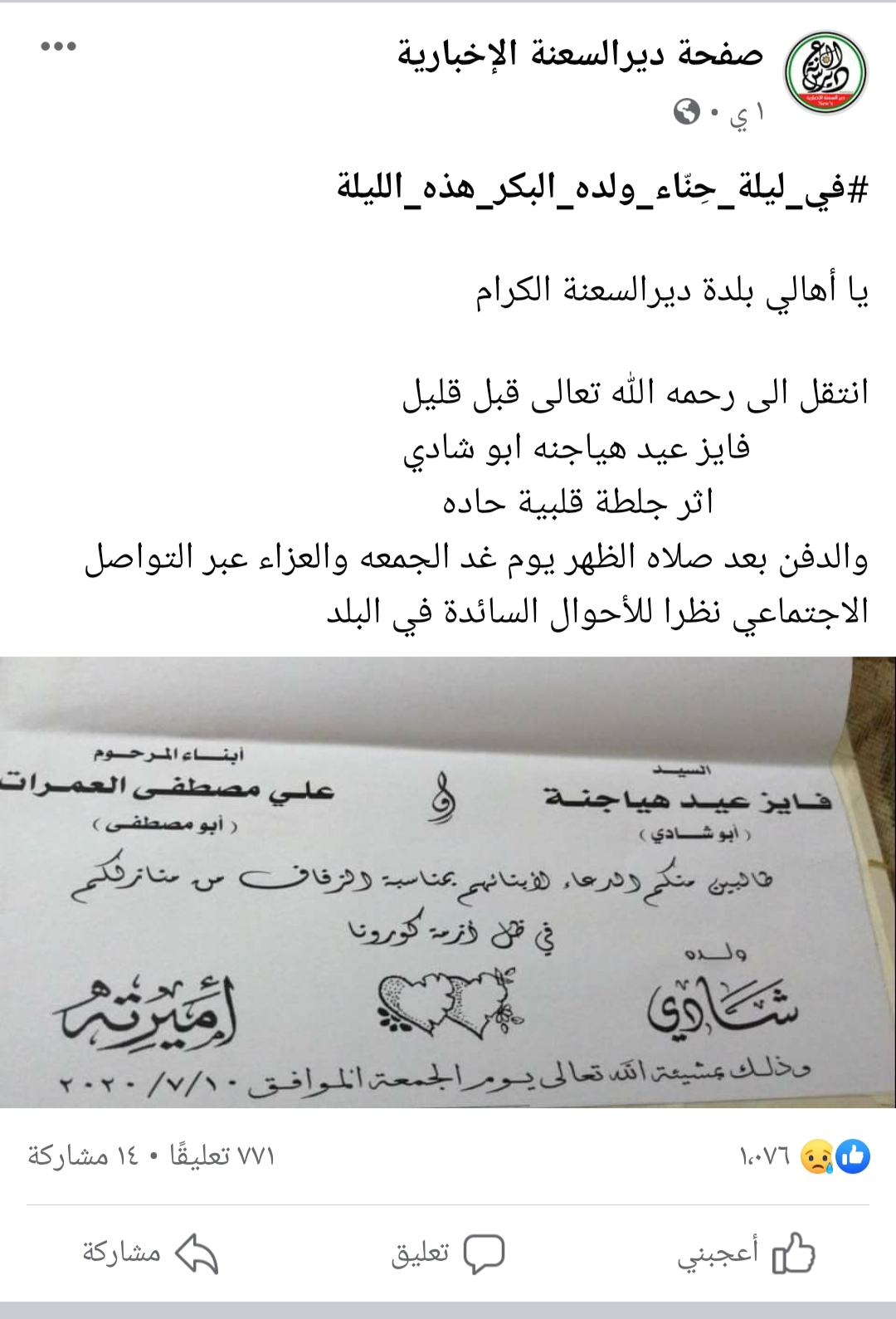 "ليلة الحنة" غالبا ما تكون من أسعد ليالي الأب، فهو يفرح بزفاف ابنه، فكيف اذا كان ابنه البِكر فالفرح مضاعف، الا أن ليلة الخميس/ الجمعة، عمها الحزن في بلدة دير السعنة بمحافظة اربد بعد وفاة فايز عيد هياجنه، في ليلة حناء ابنه البِكر "شادي".