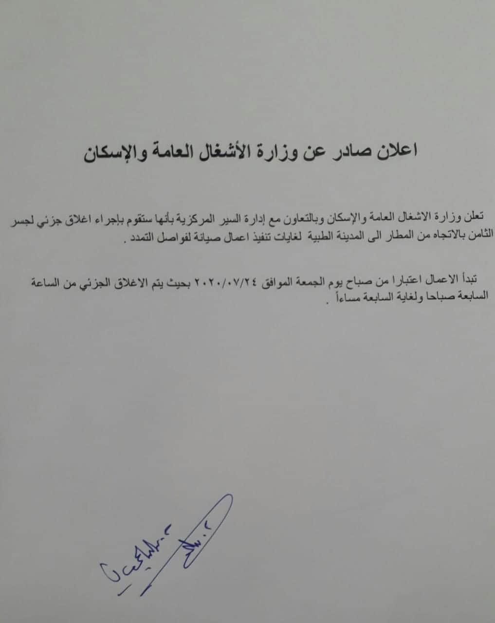 #اغلاق_جزئي #لجسر_الثامن باتجاه من المطار الى المدنية الطبية يوم الجمعة ٢٤/٧/٢٠٢٠