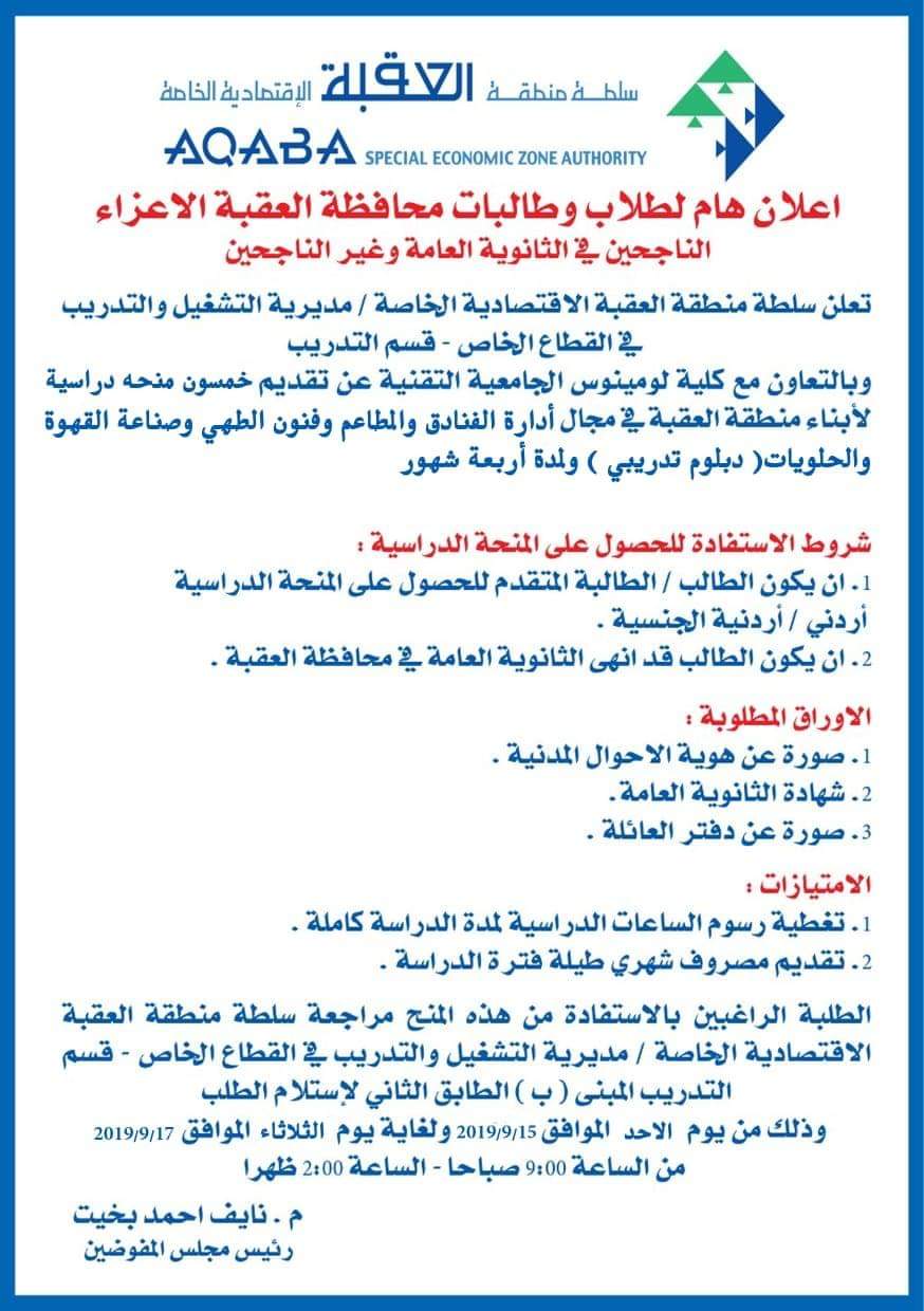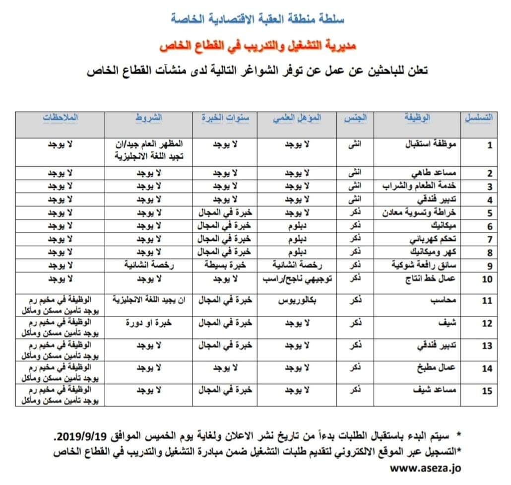 اعلان صادر عن سلطة منطقة العقبة الاقتصادية الخاصة مديرية التشغيل والتدريب في القطاع الخاص للباحثين عن عمل.