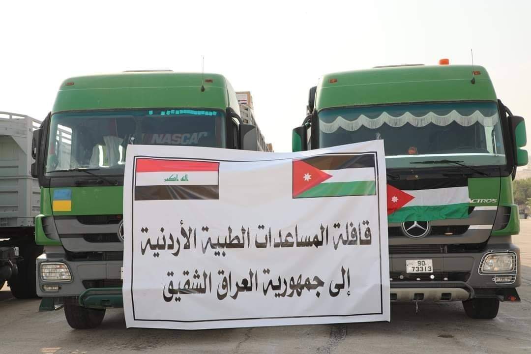 وتتألف القافلة من خمس شاحنـــات تحمل مواد ومستلزمات طبية من الكمامات، والقفازات، ومواد التعقيم، وأغطية طبية تم تصنيعها في المصانع الأردنية، لدعم جهود الفرق الطبية العاملة في العراق الشقيق لمجابهة الجائحة.
