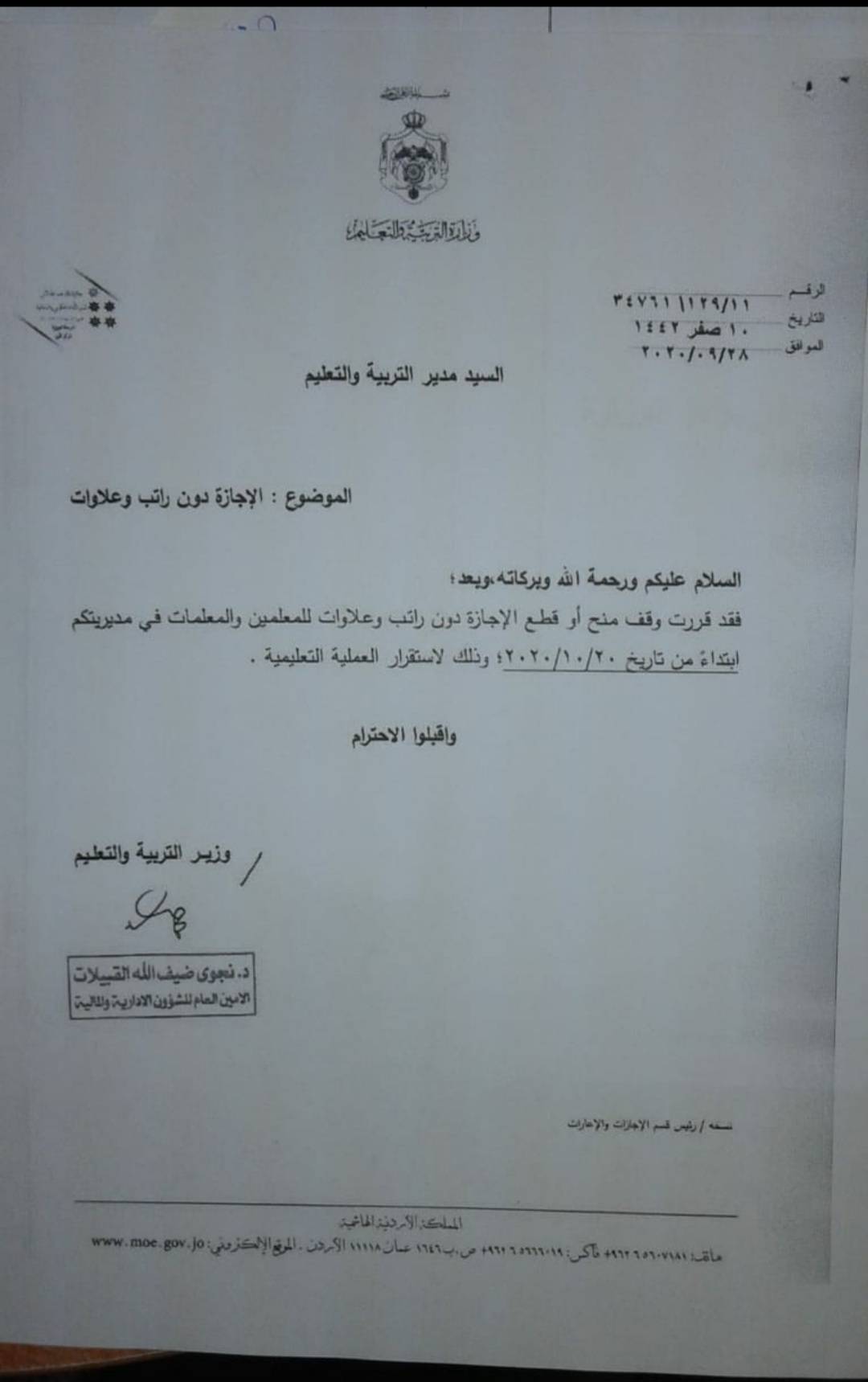 قررت وزارة التربية والتعليم وقف منح أو قطع الإجازة دون راتب وعلاوات للمعلمين والمعلمات في مديريات التربية والتعليم ابتداء من 20 / 10 / 2020 وذلك لاستقرار العملية التعليمية .