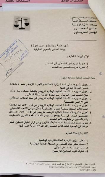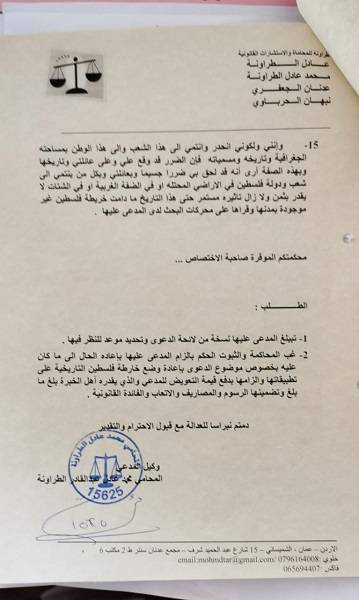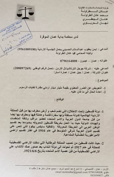 اقام مواطن اردني دعوى قضائية امام المحاكم الأردنية طالب فيها شركة جوجل بتعويض قدره مليار دينار اردني بسبب الضرر الواقع على فلسطين جراء إزالة اسم فلسطين من خرائط جوجل. وقال المواطن في شكواه : لكوني انتمي الى هذا الشعب ، فقد وقع علي وعلى عائلتي وتاريخها ضرر لا يقدر بثمن.