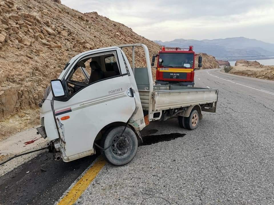 حادث تصادم وقع ما بين مركبتين ماقبل محطة الموجب السفلي باتجاه عمان ، نتج عنه وفاة شخص، وإصابة اربعة آخرين بجروح ورضوض في مختلف أنحاء الجسم، حيث عملت فرق الإسعاف على تقديم الإسعافات الأولية اللازمة للمصابين ونقلهم وإخلاء الوفاه والإصابات الى مستشفى غور الصافي، وحالة المصابين العامة متوسطة .