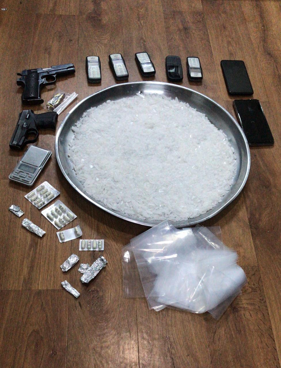 وفي محافظة اربد وردت لكوادر ادارة مكافحة المخدرات معلومات حول قيام احد الاشخاص المشبوهين بقضايا الاتجار بالمخدرات بتخزين كميات من مادة الكريستال المخدرة داخل منزله والاتجار بها حيث جرى بعد التأكد من تلك المعلومات مداهمته والقاء القبض عليه وبتفتيش المنزل عثر داخله على 3 كغم من مادة الكريستال المخدرة وكمية من الحبوب المخدرة وسلاح ناري .