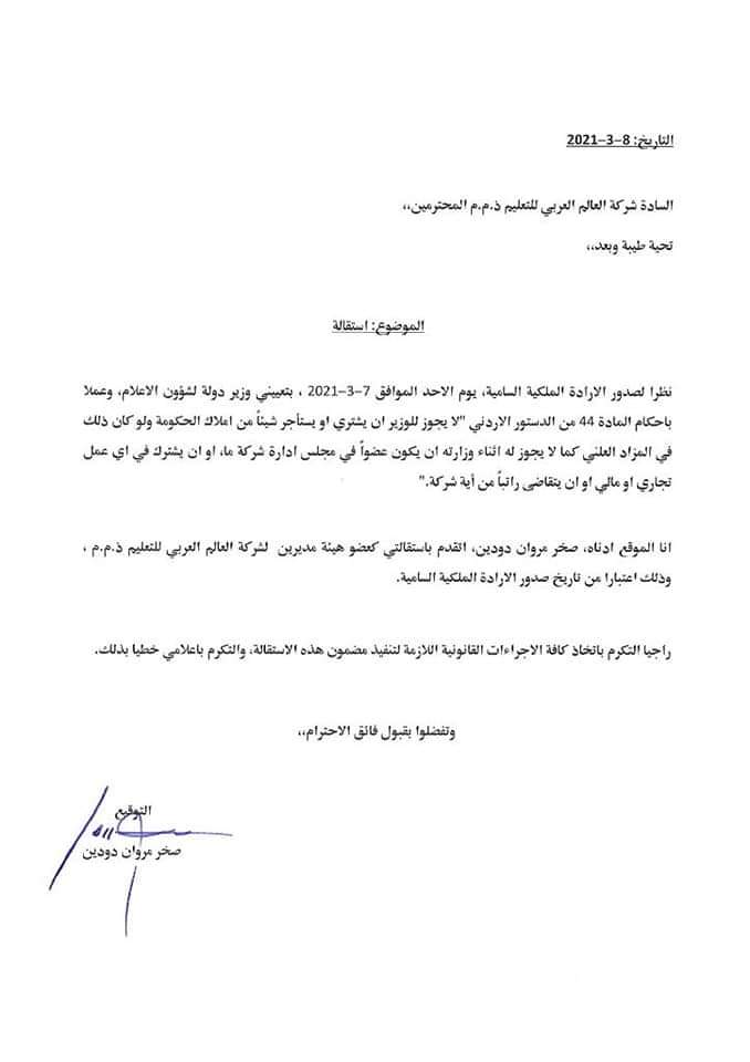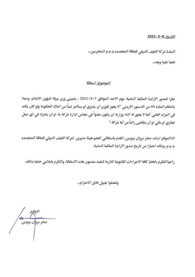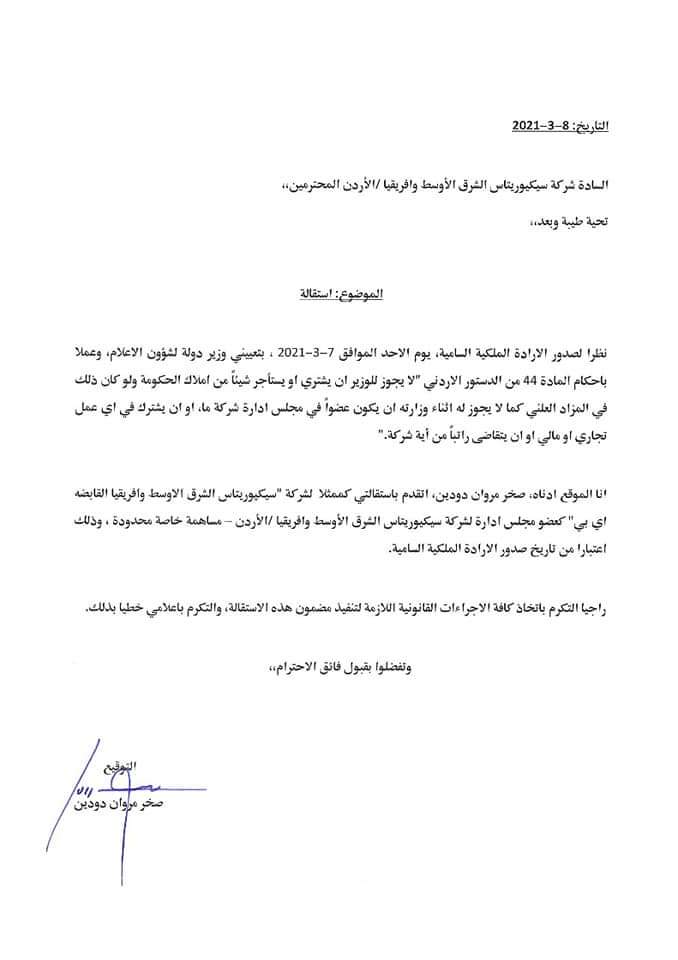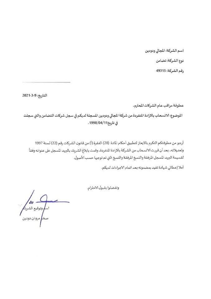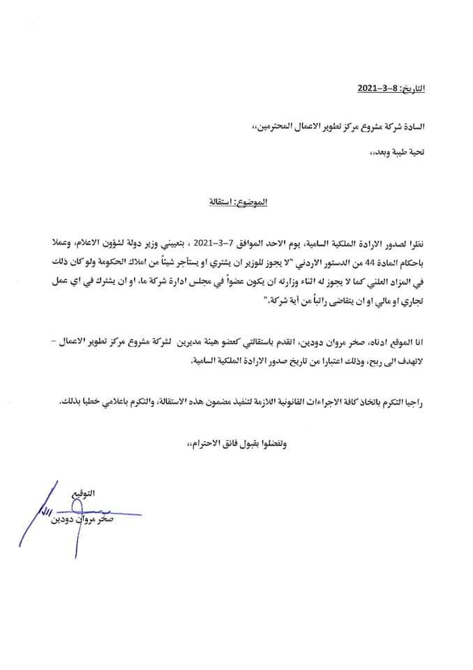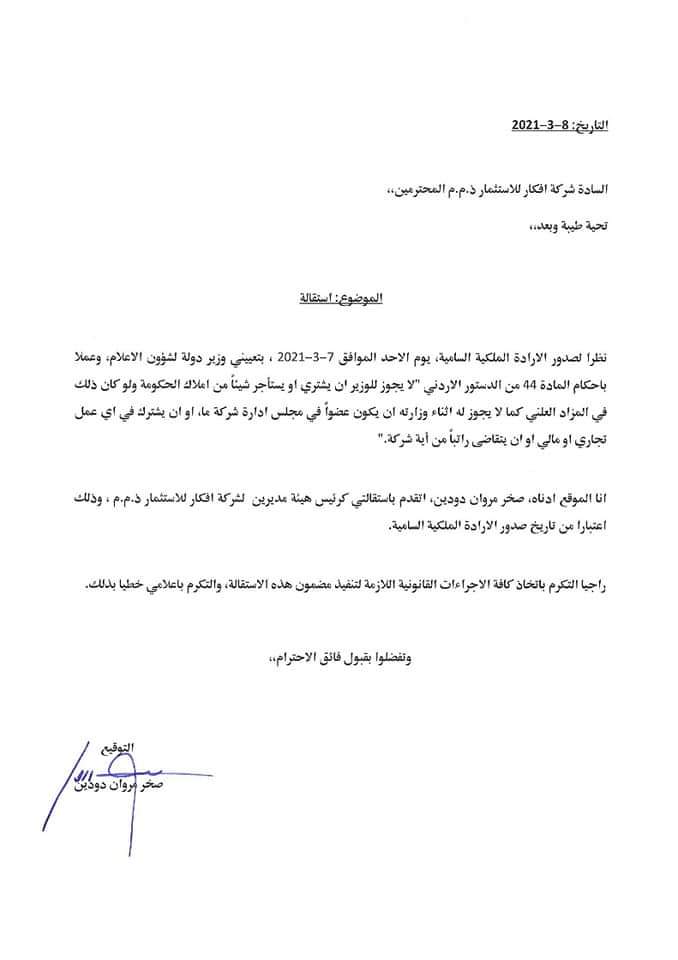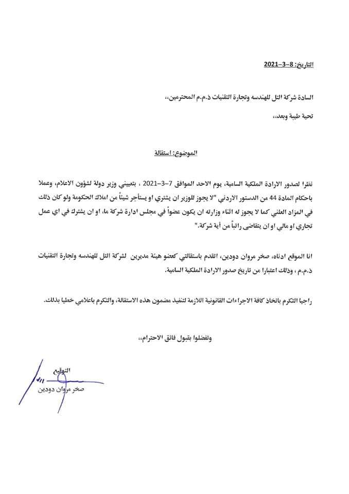 وثائق تؤكد انسحاب الوزير صخر دودين من كل الشركات التي كان شريكا بها المسلمة لمراقبة الشركات قبل استلام دودين لمنصبه بالوزارة.
