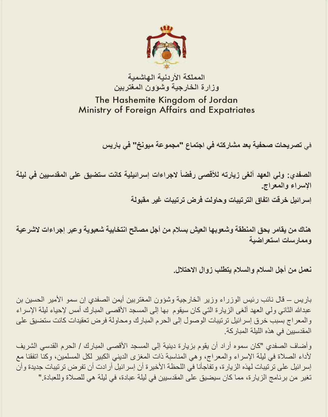 أصدرت وزارة الخارجية بياناً بخصوص إلغاء ولي العهد الأردني الأمير حسين بن عبدالله تاليا نص البيان :