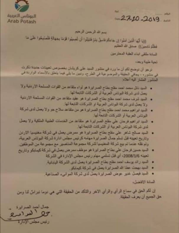 وآخر هذه الاساءات هي استخدام اسطوانة مشروخة بذكر أسماء تربطهم برئيس مجلس الادارة صلة قربى على أنهم موظفون في شركة البوتاس، هذا الافتراء استدعى الرد من شركة البوتاس بالتوضيح التالي من خلال ذكر تلك الاسماء واماكن عملهم ليس من باب الدفاع بل من باب الشفافية خصوصا بعد ان تم اغتيال شخصيات وطنية عديدة بواسطة مواقع التواصل الاجتماعي.