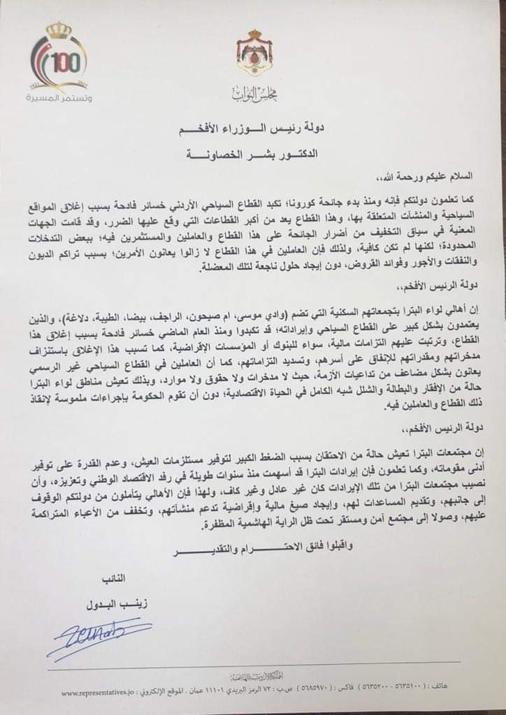 طالبت النائب زينب البدول اليوم الاثنين رئيس الوزراء الدكتور بشر الخصاونة في مذكرة مطلبية بضرورة التدخل لإنقاذ العاملين في القطاع السياحي والمنشآت السياحية في لواء البترا، وذلك من خلال تقديم مساعدات وحوافز وقروض عاجلة للتخفيف من تداعيات الجائحة.