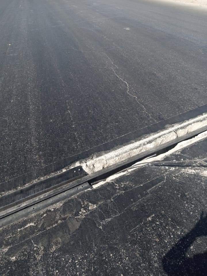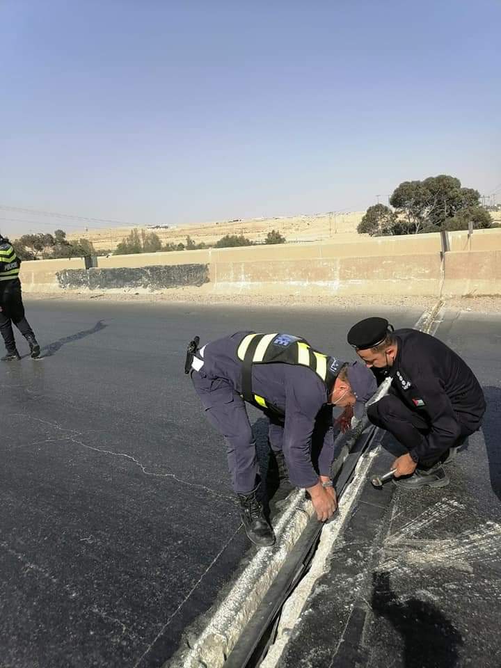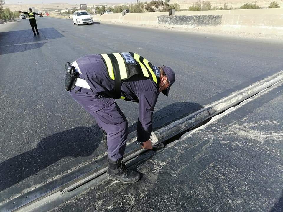 ورد بلاغ لغرفة العمليات الرئيسية بوجود إعاقة لمسير المركبات على أعلى جسر الحرة / الزرقاء وهي عباره عن قضبان حديدية خارجة من فواصل الجسر ووجودها بهذه الصورة يسبب أضرار المركبات وقد تؤدي إلى وقوع حوادث لا قدر الله .