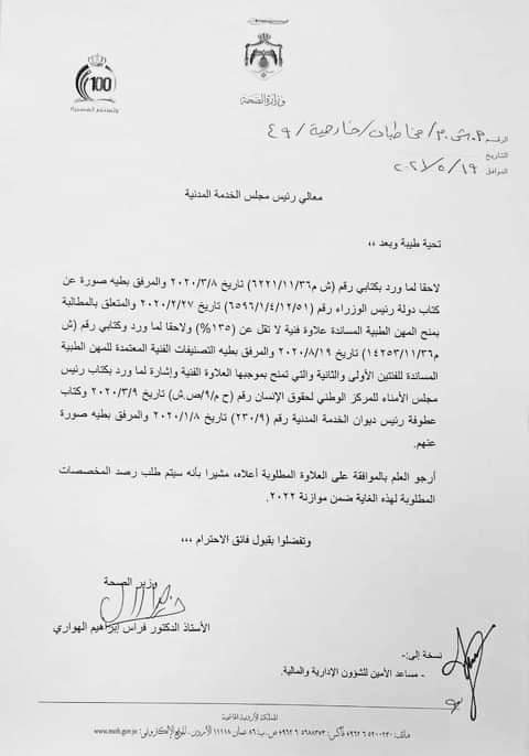 خاطب وزير الصحة د. فراس الهواري ديوان الخدمة المدنية بعد موافقة رئيس الوزراء على صرف علاوة فنية لموظفي وزارة الصحة المهن الطبية المساندة بنسبة ١٣٥٪ على أن تصرف بداية العام المقبل ويتم رصد المخصصات اللازمة لذلك.