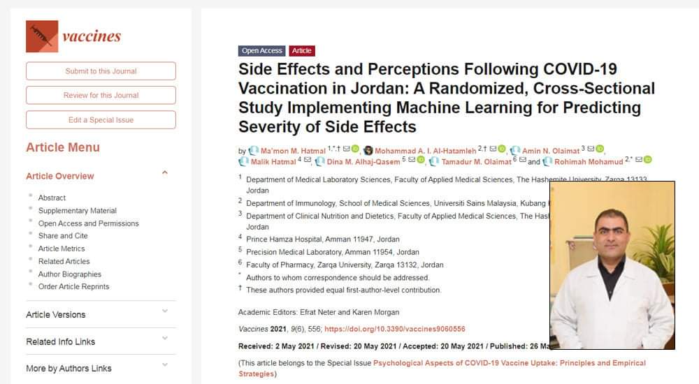 وحملت الدراسة عنوان: "الأعراض الجانبية والتصورات بعد التطعيم ضد فيروس كورونا المستجد COVID-19 في الأردن: دراسة مسحية عشوائية مع استخدم لغة الآلة للتنبؤ بشدة الأعراض الجانبية".