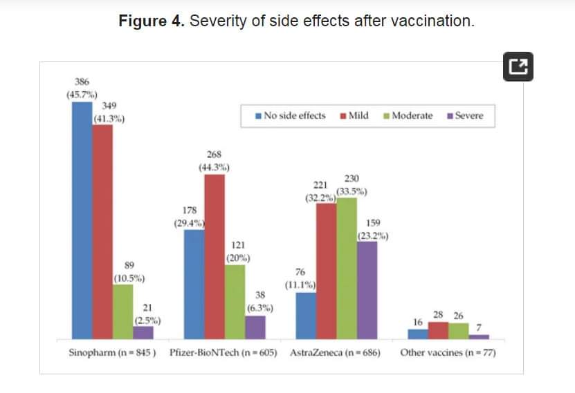 وقال الدكتور حتمل، وهو أستاذ مشارك في قسم العلوم الطبية المخبرية في الجامعة الهاشمية، إن الدراسة كشفت أن معظم الأعراض الجانبية بعد التطعيم هي أعراض شائعة وغير خطيرة مثل التعب، والقشعريرة، والدوخة، والحمى، والصداع، وآلام المفاصل، وآلام العضلات. ووجدت الدراسة أن 10٪ فقط من المشاركين عانوا من أعراض جانبية شديدة.
