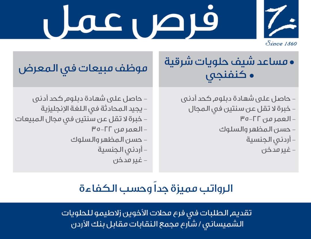 الرجاء تقديم الطلب في فرع الشميساني (شارع مجمع النقابات) أو على البريد الإلكتروني: jobs@zalatimo.com
