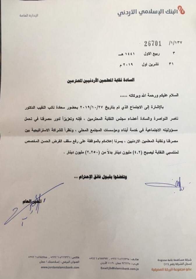 رفع سقف القرض الحسن من ٢مليون إلى ٤مليون دينار نقابة المعلمين الأردنيين.