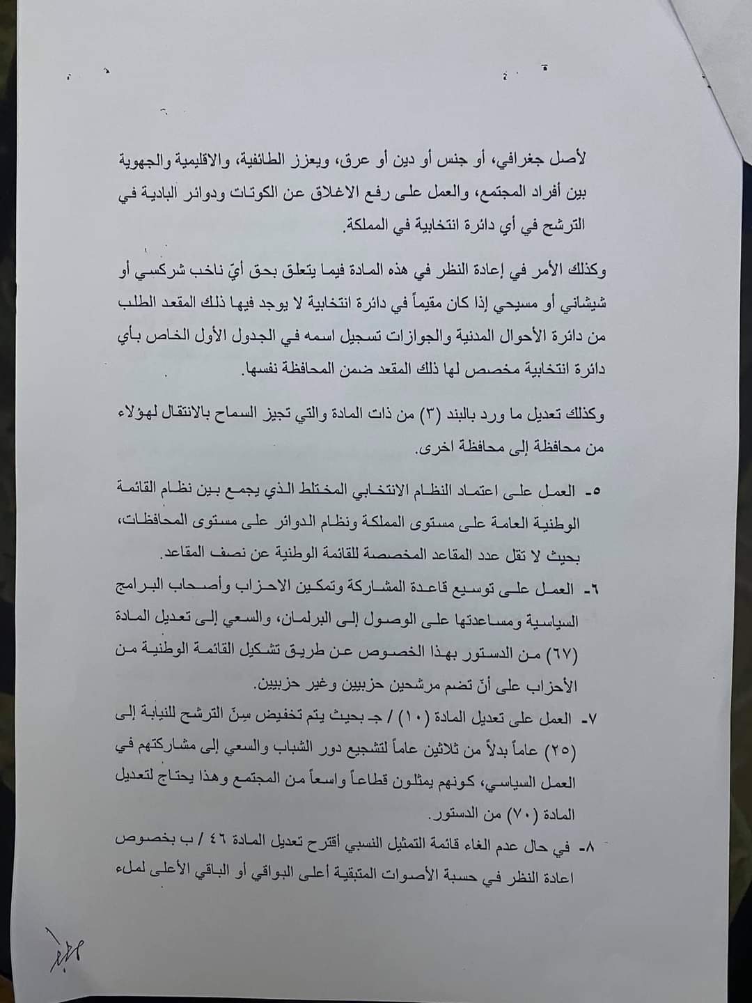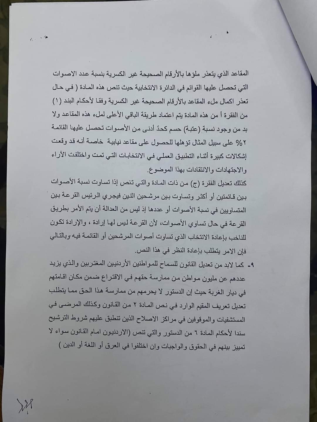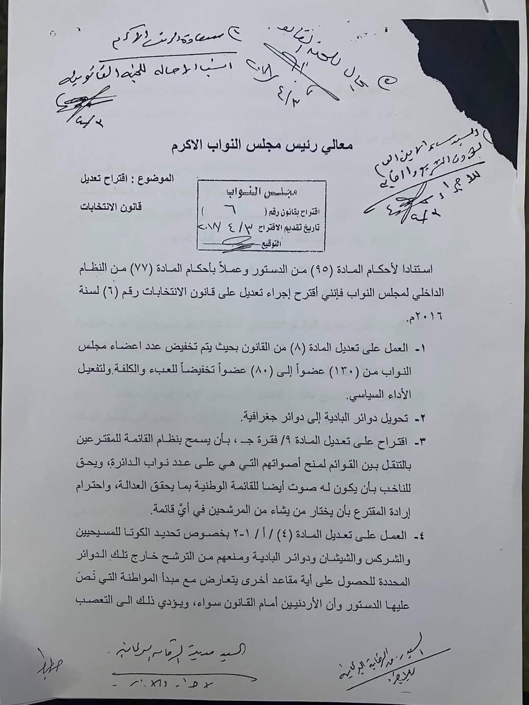 تقدمت كتلة الإصلاح النيابية بمشروع قانون الإنتخابات بتاريخ ٣-٤-٢٠١٨ وأحيل الى اللجنة القانونية لدراسته إستنادا لأحكام المادة (٩٥ )من الدستور وقد أرسل نسخة منه الى حكومة الرئيس عمر الرزاز آنذاك وقد ورد رد على المشروع تبني الحكومة لهذا المشروع.