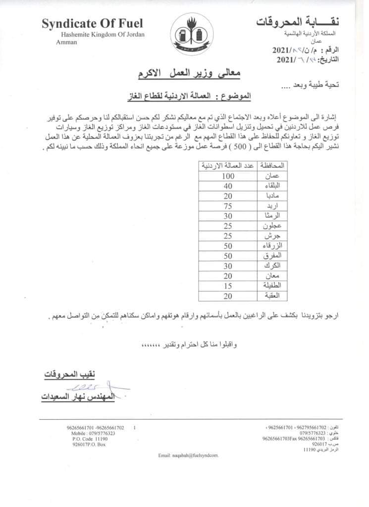 وأشارت إلى أنه يتوفر حالياً 500 فرصة عمل للأردنيين في هذا القطاع بهذه المهنة "تحميل وتنزيل أسطوانات الغاز" موزعة على جميع انحاء المملكة.