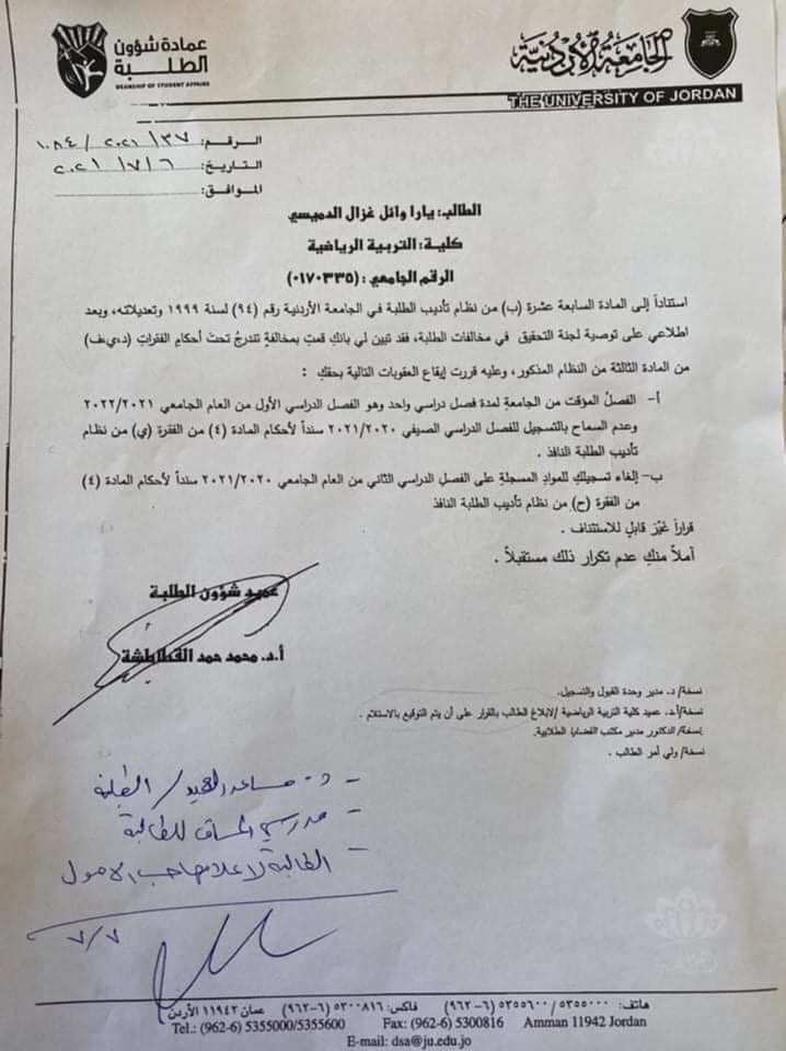 الجامعة الأردنية تقرر فصل الطالبة يارا الدميسي