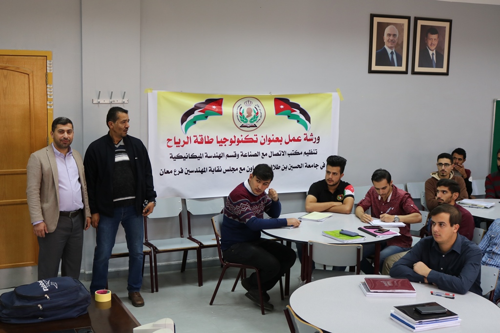 عقدت في قاعة البترا في عمادة شؤون الطلبة، ورشة عمل بعنوان" تكنولوجيا طاقة الرياح" بتنظيم من قسم الهندسة الميكانيكية في كلية الهندسة بجامعة الحسين بن طلال ومكتب الاتصال مع الصناعة وبالتعاون مع مجلس نقابة المهندسين – فرع معان. قدّم المهندس عبدالرحمن صلاح من نقابة المهندسين محاضرة بين فيها آلية العمل وآخر ما توصلت اليه التكنولوجيا الحديثة في هذا المجال وأهم متطلبات المعرفة والمهارات المطلوبة من المهندسين العاملين في هذا القطاع الهام. وأكّد الدكتور محمد الشلبي من قسم الهندسة الميكانيكية في جامعة الحسين بن طلال، على أهمية مثل هذه الورش للعمل على رفد الطلبة بالمعرفة والخبرات اللازمة لسوق العمل في مجال طاقة الرياح حيث تعد مشاريع طاقة الرياح أحد أهم المشاريع الريادية في منطقة الشرق الأوسط والتي ستعمل على توفير طاقة نظيفة وخفض كلف الإنتاج خلال السنوات القادمة. وقال مدير مكتب الاتصال مع الصناعة في جامعة الحسين بن طلال أحمد عبدالله ابو جري، أن هذه الورشة تأتي ضمن خطة المكتب للعمل على تأهيل طلبة الجامعة وإكسابهم المعرفة والمهارات المطلوبة لسوق العمل بالتنسيق مع المصانع والمؤسسات الكبرى في المنطقة لمعرفة احتياجاتها خاصة بأن مشاريع الطاقة البديلة تتنامى بشكل سريع في المملكة ومحافظة معان على وجه التحديد ولهذا يجب تسليح طلبة الجامعة بالمعرفة والمهارات المطلوبة لتعزيز فرصهم في الحصول على عمل في هذه المشاريع بعد التخرج مثمنًا التعاون الكبير الذي يقدمه مجلس فرع نقابة المهندسين الاردنيين فرع معان ممثلا برئيس المجلس المهندس محمد الشمري وكافة منتسبي الفرع .