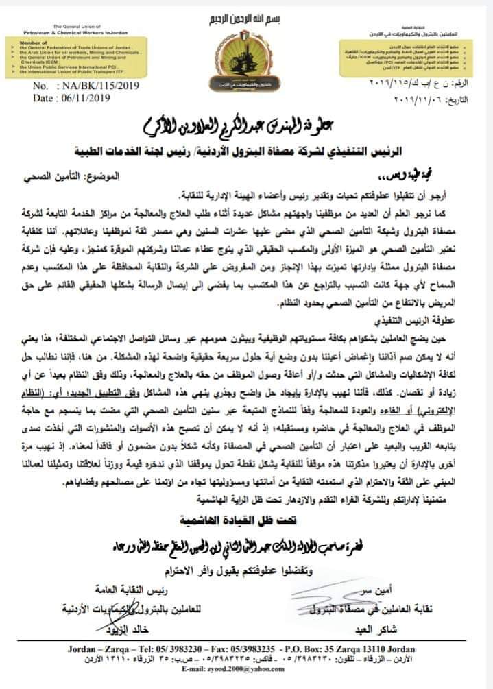 وجه رئيس نقابة البترول والكيماويات السيد خالد الزيود في كتاب إلى الرئيس التنفيذي لشركة مصفاة البترول الاردنية هذا نص الكتاب الوارد بادناة: