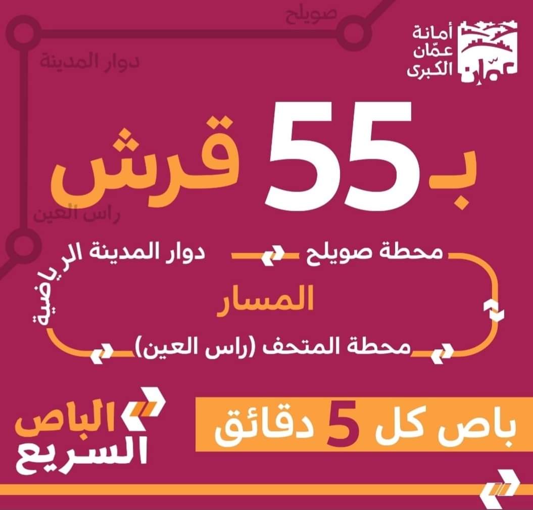 تعلن أمانة عمّان أنه ولغايات تقييم وإختبار خيارات التشغيل التجريبي للباص سريع التردد واعتباراً من يوم الأحد ٢٩ / ٨ / ٢٠٢١ ستكون التعرفة ثابتة بقيمة 55 قرش لكل إتجاه على مسار محطة صويلح / دوار المدينة الرياضية / محطة متحف الأردن ( راس العين ) وبالعكس .