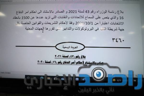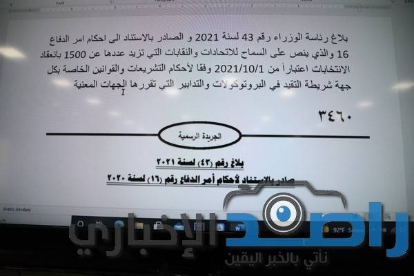 13. بلاغ رئاسة الوزراء رقم 43 لسنة 2021 و الصادر بالاستناد الى احكام امر الدفاع 16 و الذي ينص على السماح للاتحادات و النقابات التي تزيد عددها عن 1500 بانعقاد الانتخابات وفقا لاحكام التشريعات و القوانين الخاصه بكل جهه شريطة التقيد في البروتوكولات و التدابير التي تقررها الجهات المعنية
