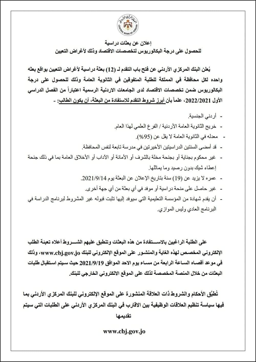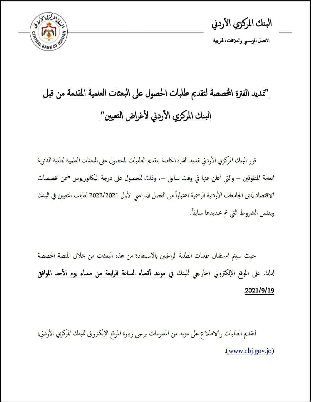 "قرر البنك المركزي الأردني تمديد الفترة الخاصة بتقديم الطلبات للحصول على البعثات العلمية لطلبة الثانوية العامة المتفوقين وذلك للحصول على درجة البكالوريوس ضمن تخصصات الاقتصاد لدى الجامعات الأردنية الرسمية اعتباراً من الفصل الدراسي الأول 2021/2022، حتى يوم الأحد الموافق 19/9/2021 ولغاية الساعة الرابعة مساءاً.