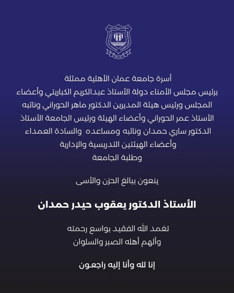 جامعة عمان الأهلية تنعي المرحوم أ.د. حمدان2025-12-29 -