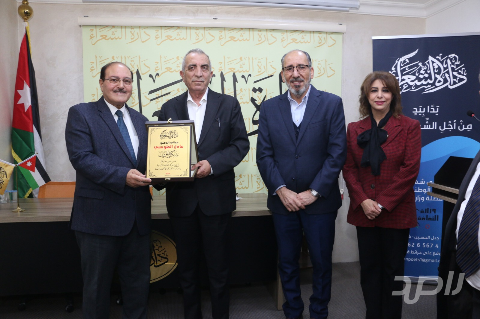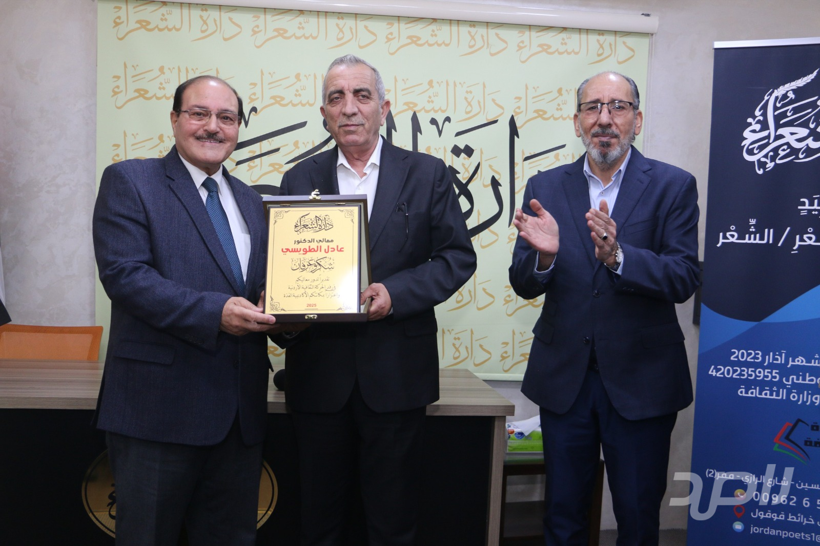 وفي ختام الحفل، سلم وزير الثقافة الدكتور مصطفى الرواشدة درع الشرف التقديري المقدم من دارة الشعراء الأردنيين إلى الدكتور عادل الطويسي، كتعبير رمزي عن الاعتراف بمسيرته الغنية وإسهاماته الممتدة في خدمة الثقافة والهوية الوطنية.