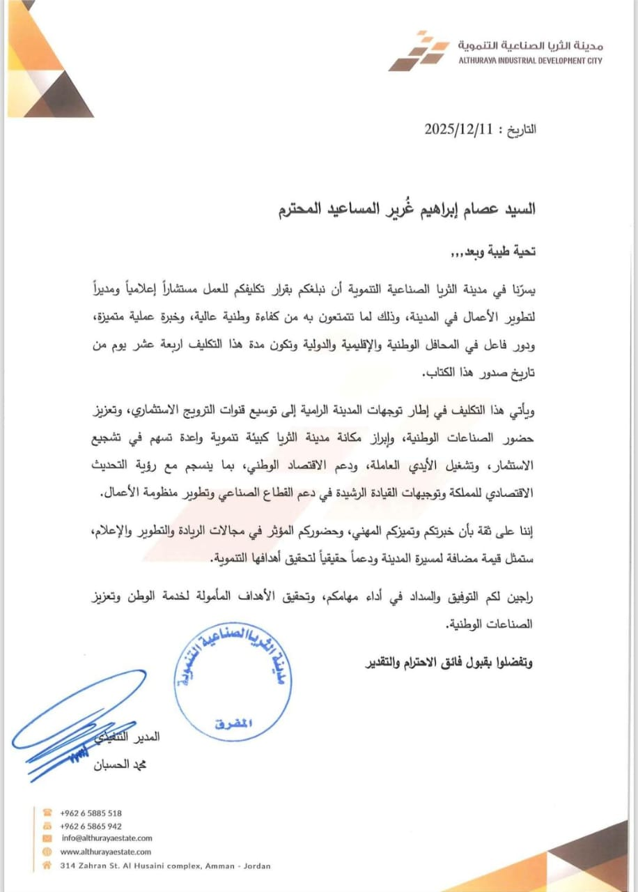 أعلنت مدينة الثريا الصناعية التنموية عن تكليف الأستاذ عصام المساعيد بمهام المستشار الإعلامي ومدير لتطوير الأعمال اعتبارًا من اليوم، وذلك بموجب قرار رسمي صادر عن الإدارة التنفيذية للمدينة، تقديرًا لكفاءته الوطنية وخبرته العملية وحضوره البارز في المحافل الوطنية والإقليمية والدولية.
