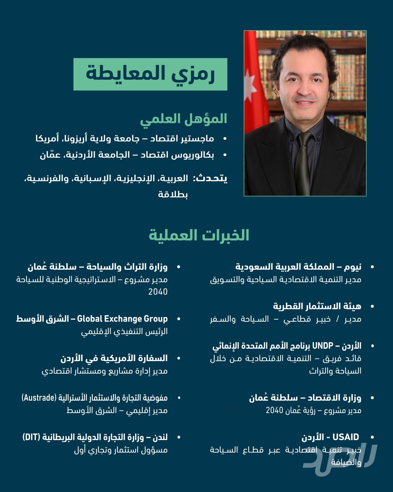 قرر مجلس إدارة هيئة تنشيط السياحة تعيين السيد رمزي المعايطة مديرًا عامًا للهيئة، استنادًا إلى مؤهلاته العلمية وخبراته المهنية المتخصصة في قطاع السياحة.