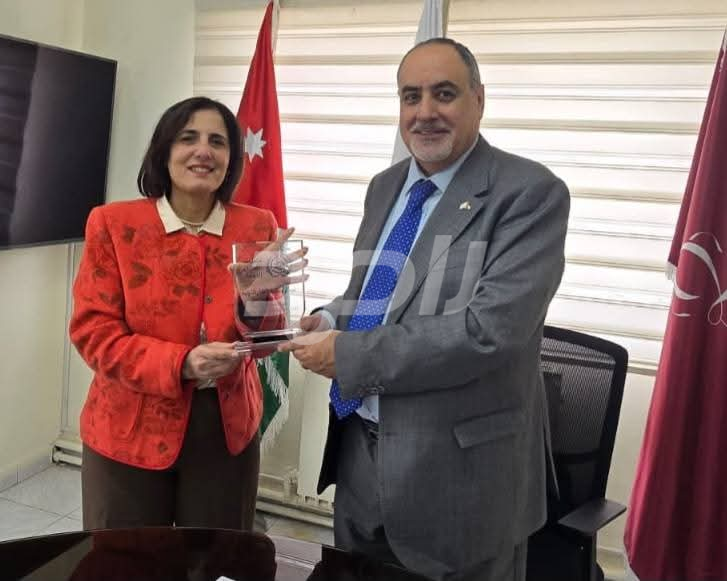 كرمت مديرة برنامج العمل اللائق للمرأة في منظمة العمل الدولية ريم أصلان، رئيس الاتحاد العام لنقابات عمال الأردن خالد الفناطسة، بدرع المنظمة؛ تقديرا للشراكة التي تجمع الطرفين، وللجهود التي بذلها الاتحاد في إنجاح مشروع "قوة النقابات من أجل عالم عمل أكثر شمولا ومساواة بين الجنسين".